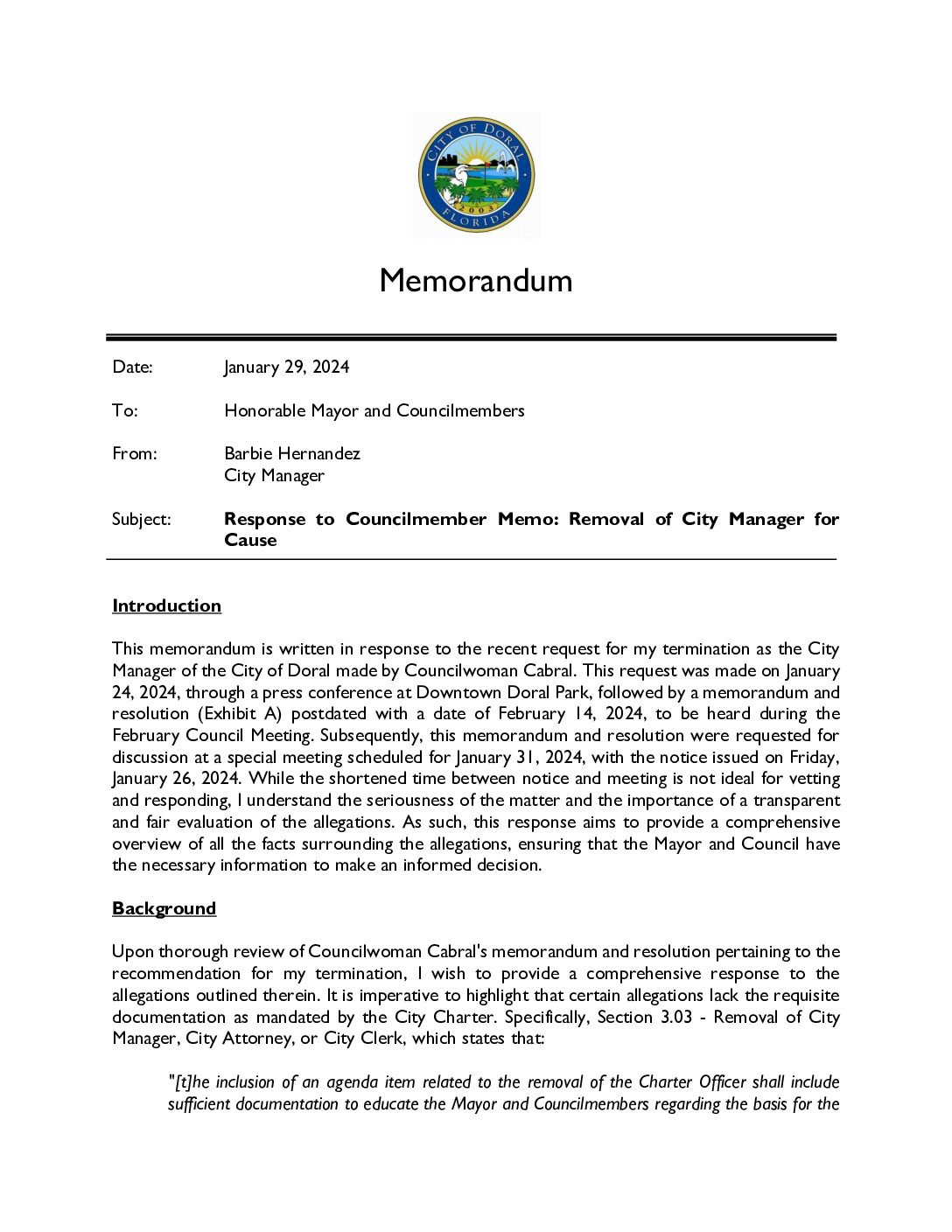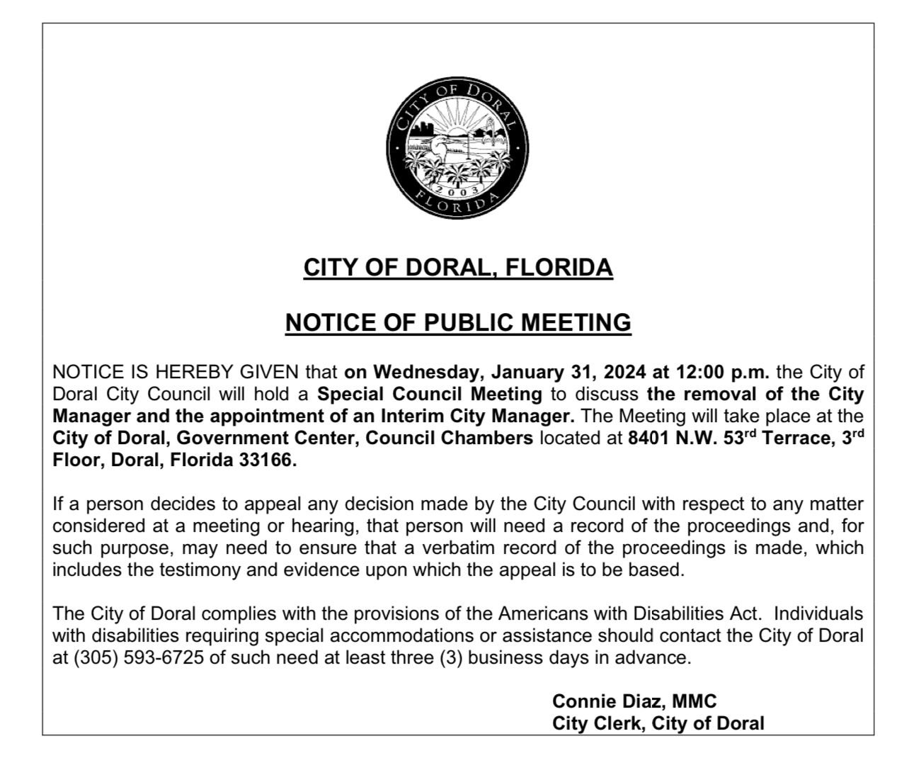 La ciudad de Doral anunció una reunión en la sede del ayuntamiento para el miércoles 31 de enero a las 12 del mediodía para discutir la posible destitución de la City Manager, Barbie Hernández. El proyecto de remoción de la administradora fue presentado por la concejal Digna Cabral, quien basó su propuesta a un supuesto “conflicto de intereses” que involucraría a Hernández.
