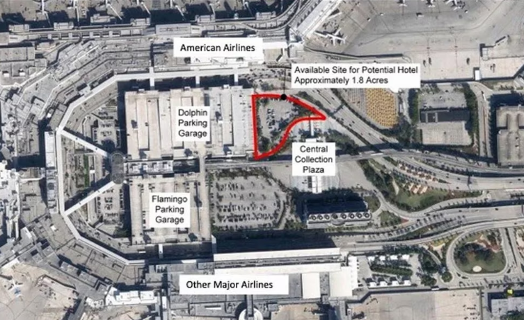 Las propuestas responden a la convocatoria que el condado emitió en septiembre de 2020. El futuro hotel ocupará un terreno de 4046,86 metros cuadrados (1,8 acres) al noreste del aeropuerto y estaría conectado a la Terminal D mediante un puente peatonal. La ubicación estratégica, junto al sector Dolphin del estacionamiento, permitiría a los pasajeros un acceso fácil y rápido a la zona de partidas y llegadas.