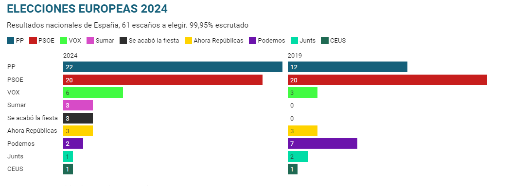 Ciudadanos queda fuera del Parlamento Europeo: pierde sus ocho diputados al conseguir únicamente el 0,69 por ciento de los votos. Ahora Repúblicas (ERC, Bildu, BNG y Ara Més) logra tres representantes, mientras Junts se deja dos y se queda solo con uno, al igual que CEUS, donde está el PNV. Con respecto a las anteriores elecciones europeas de 2019, el PP es el partido que más crece, 14 puntos al pasar del 20,15 por ciento al 34,19.