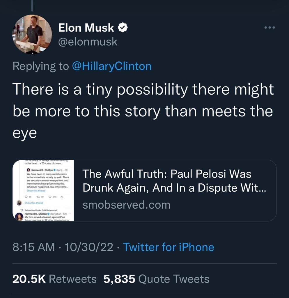 El nuevo dueño de Twitter publicó el domingo un tuit con un enlace que dirige a un artículo con afirmaciones sin pruebas sobre el incidente registrado el viernes en la casa de San Francisco de la congresista, reseña El Tiempo Latino. El tuit respondió a uno de Hilary Clinton a las 8:15 am, pero Musk lo eliminó a las 2:00 pm.