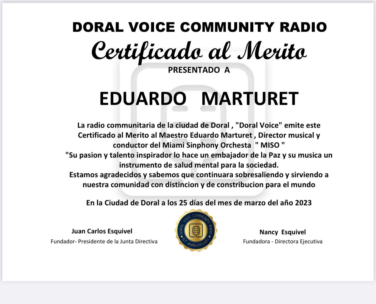 De esta manera, la radio comunitaria de la Cuidad de DORAL «Doral Voice» emite este certificado de Mérito a Eduardo Marturet, director musical y conductor de Orquesta (MISO), la Orquesta Sinfónica Oficial de la Ciudad de Miami.